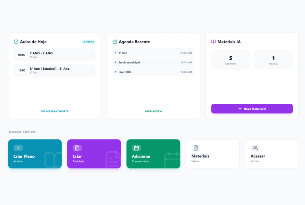 Planeje aulas até 80% mais rápido, organize sua rotina escolar e pare de carregar a escola nas costas. Tudo em um único sistema.
